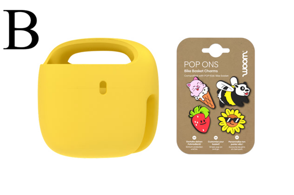 Set van 4 opklikaccessoires waarmee je kind het POP-kinderfietsmandje helemaal naar eigen smaak kan versieren – voor nog meer fietsplezier.